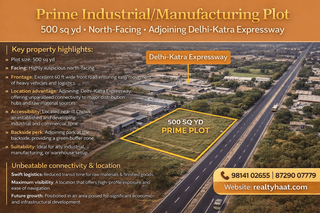 Prime industrial/manufacturing plot - 500 sq yd - North facing - Adjoining Delhi-Katra expressway This is a rare and strategic investment opportunity to acquire a highly sought-After industrial/manufacturing plot in a prime location near IT chowk. Key property highlights Plot size: 500 sq yd Facing: Highly auspicious north facing
